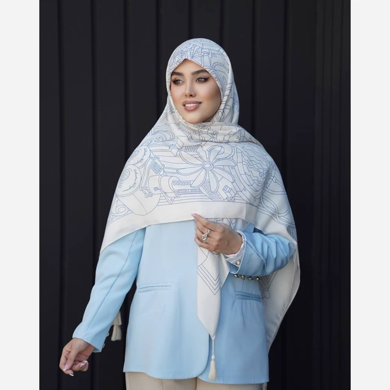 روسری ابریشم ژاکارد 1404 طرح هندسی دور دست دوز